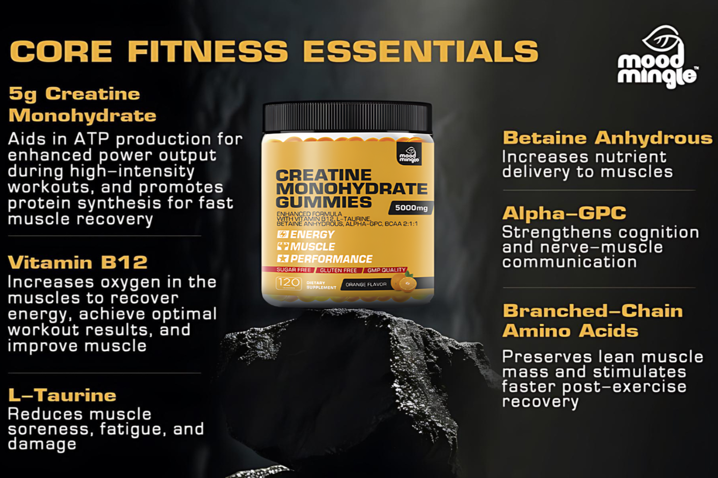 Each gummy combines creatine monohydrate for muscle strength, vitamin B12 for energy support, and L-Taurine for enhanced endurance. Betaine Anhydrous and Alpha-GPC promote optimal hydration and focus, while Branched Chain Amino Acids aid in muscle recovery. These gummies are your all-in-one solution for achieving core fitness goals with ease.
