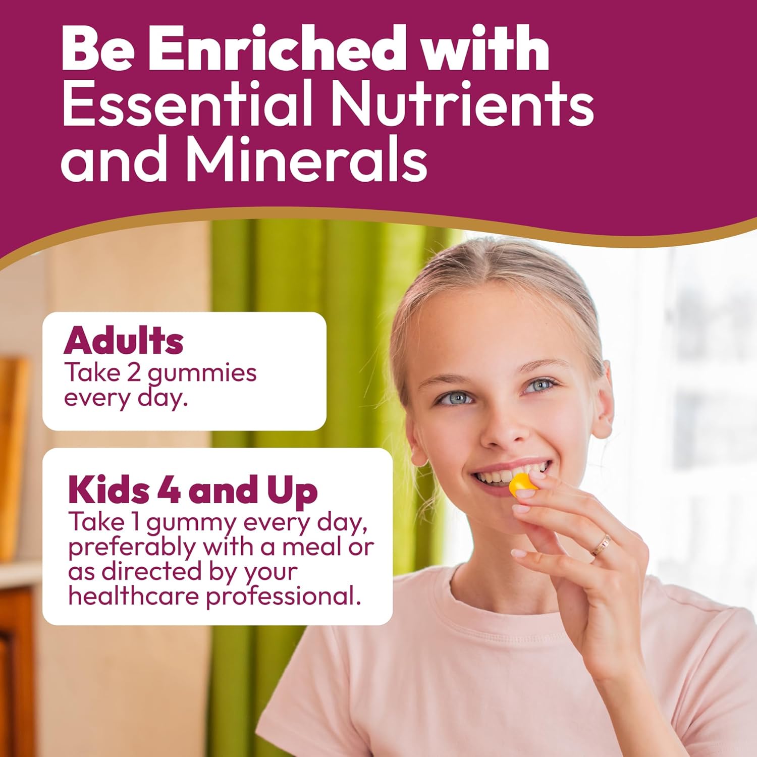 Kids (Aged 4 and Up): Take 1 Gummy Daily, Preferably with a Meal or as Directed by a Healthcare Professional.